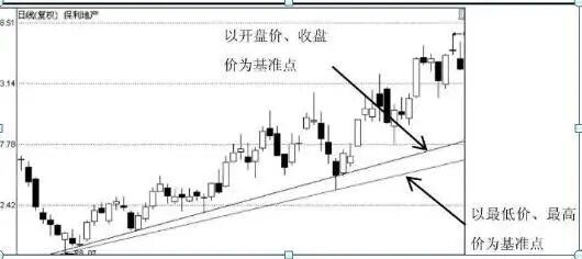 如何绘制趋势线,到底是应该以最高价、最低价为基准点,还是以收盘价、开盘价为基准点,现在很难有一个统一的结论。虽然在每一次画趋势线时,这两种画法只能有一种是对的,但究竟谁对谁错,事先谁也不能下定论,这要根据当时盘中的实际情况来确定,如图所示。