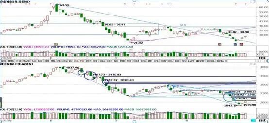 如图1-5:现代制药,它即是医药股,又是央企改革,上海板块,业绩绩优,多题材共振,在大盘从5178下跌到3373后反弹的第一波走的比大盘强,大盘反弹三天,它连接4个板,大盘调整三天,它只调整二天,所以当大盘在第二波反弹前,你就应该选出类似该股形态的个股,前面走的比大盘更强的个股,当大盘企稳后,其后续走势多半仍旧比大盘强,大盘第二波反弹,它又远强于大盘,几乎收复整个下跌跌幅,而在这波下跌到2850的大跌后,它比大盘提早止跌一天,反弹也比大盘强,这就是所谓的强者恒强。依照强势个股的前期强势走势去选股,然后期待其后续的继续强势,当然,也有些个股是前面强,后面会弱,所以这类个股要多筛选几只,持续跟踪,确保胜率,比如机器人,就是大盘从5178下面第一波走的强,但第二波就不行了。所以我做过机器人第一波后就基本抛弃了它。