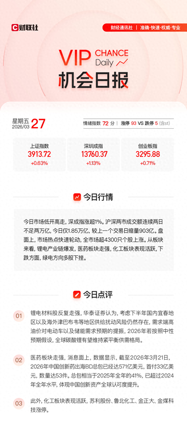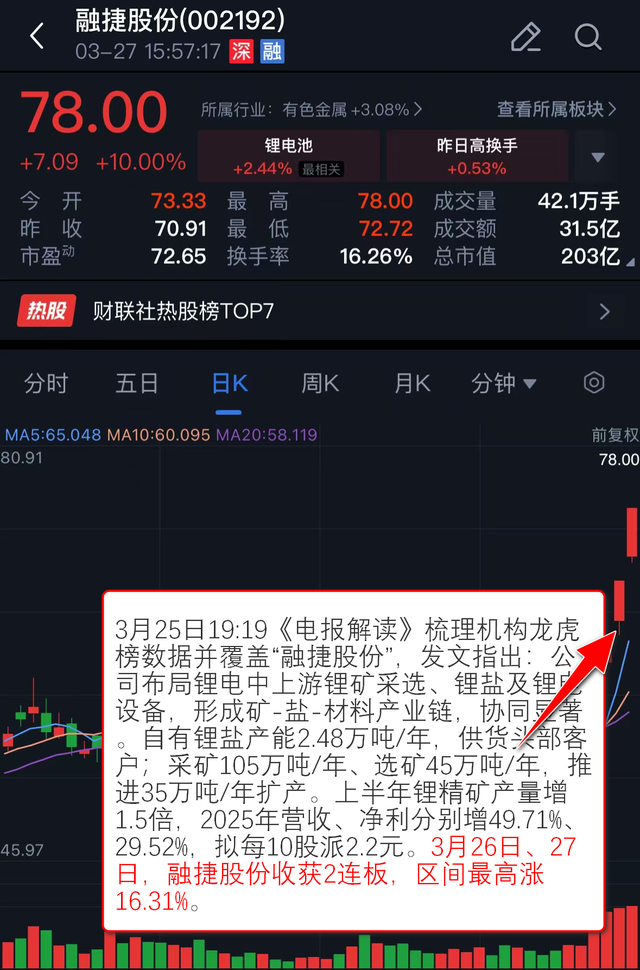 3月25日19:19《电报解读》 梳理机构龙虎榜数据并覆盖“融捷股份”,发文指出:公司布局锂电中上游锂矿采选、锂盐及锂电设备,形成矿-盐-材料产业链,协同显著。自有锂盐产能2.48万吨/年,供货头部客户;采矿105万吨/年、选矿45万吨/年,推进35万吨/年扩产。上半年锂精矿产量增1.5倍,2025年营收、净利分别增49.71%、29.52%,拟每10股派2.2元。3月26日、27日,融捷股份收获2连板,区间最高涨16.31%。