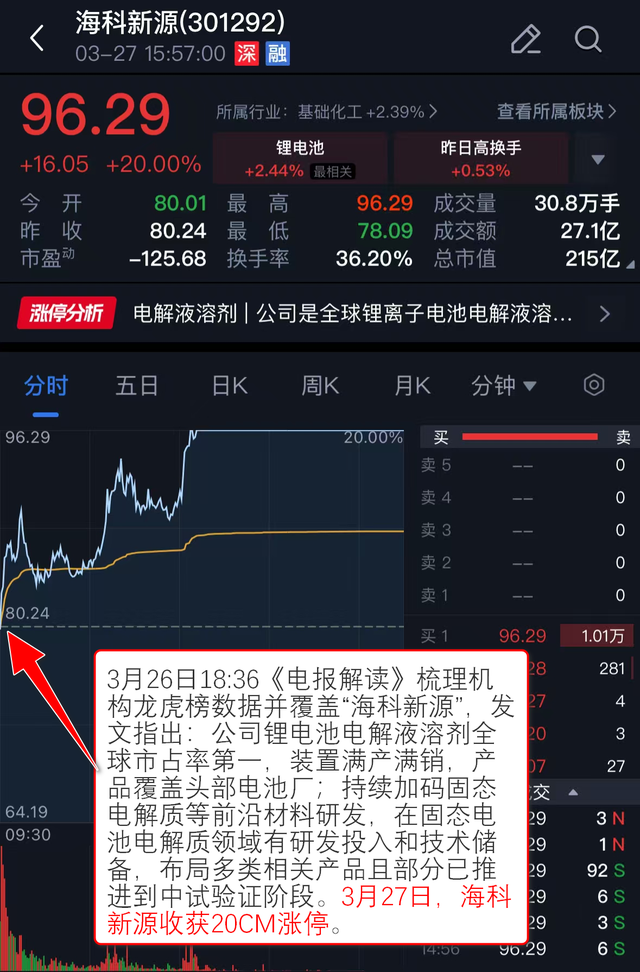 3月26日18:36《电报解读》 梳理机构龙虎榜数据并覆盖“海科新源”,发文指出:公司锂电池电解液溶剂全球市占率第一,装置满产满销,产品覆盖头部电池厂;持续加码固态电解质等前沿材料研发,在固态电池电解质领域有研发投入和技术储备,布局多类相关产品且部分已推进到中试验证阶段。3月27日,海科新源收获20CM涨停。