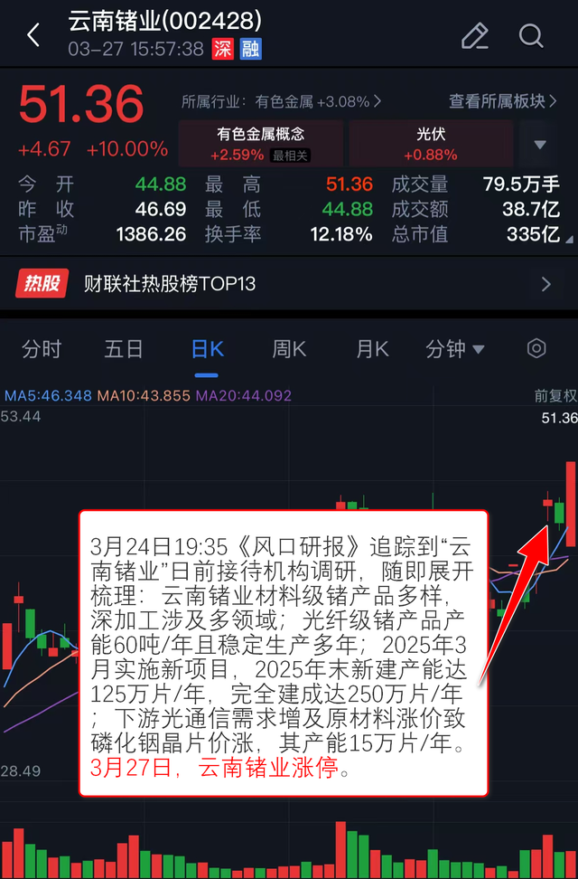3月24日19:35《风口研报》 追踪到“云南锗业”日前接待机构调研,随即展开梳理:云南锗业材料级锗产品多样,深加工涉及多领域;光纤级锗产品产能60吨/年且稳定生产多年;2025年3月实施新项目,2025年末新建产能达125万片/年,完全建成达250万片/年;下游光通信需求增及原材料涨价致磷化铟晶片价涨,其产能15万片/年。3月27日,云南锗业涨停。