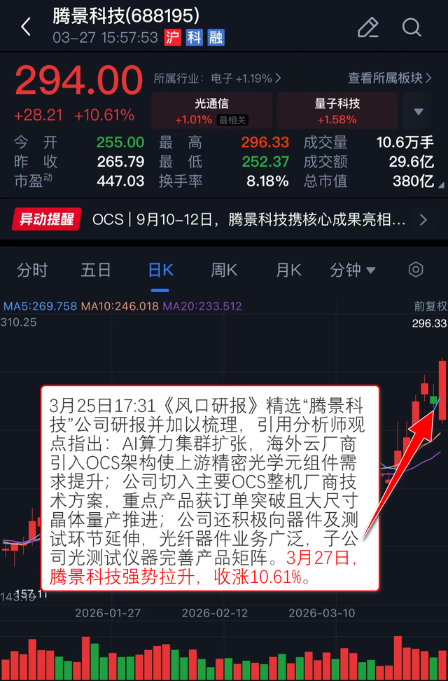 3月25日17:31《风口研报》 精选“腾景科技”公司研报并加以梳理,引用分析师观点指出:AI算力集群扩张,海外云厂商引入OCS架构使上游精密光学元组件需求提升;公司切入主要OCS整机厂商技术方案,重点产品获订单突破且大尺寸晶体量产推进;公司还积极向器件及测试环节延伸,光纤器件业务广泛,子公司光测试仪器完善产品矩阵。3月27日,腾景科技强势拉升,收涨10.61%。