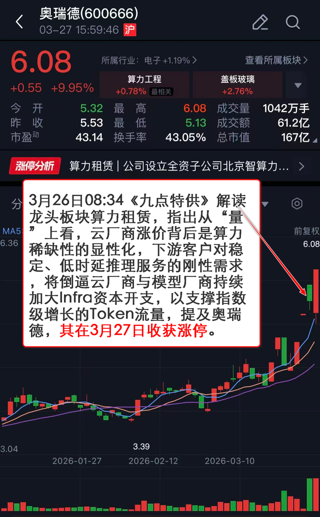 3月26日08:34《九点特供》 解读龙头板块算力租赁,指出从“量”上看,云厂商涨价背后是算力稀缺性的显性化,下游客户对稳定、低时延推理服务的刚性需求,将倒逼云厂商与模型厂商持续加大Infra资本开支,以支撑指数级增长的Token流量,提及奥瑞德,其在3月27日收获涨停。