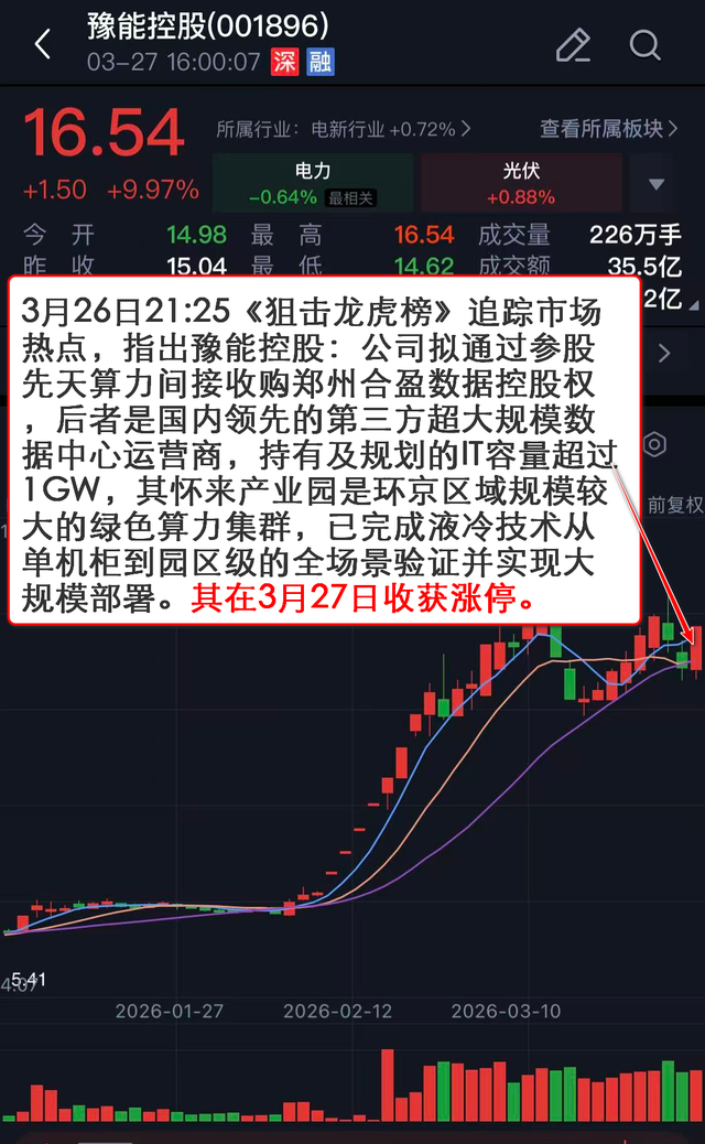 3月26日21:25《狙击龙虎榜》 追踪市场热点,指出豫能控股:公司拟通过参股先天算力间接收购郑州合盈数据控股权,后者是国内领先的第三方超大规模数据中心运营商,持有及规划的IT容量超过1GW,其怀来产业园是环京区域规模较大的绿色算力集群,已完成液冷技术从单机柜到园区级的全场景验证并实现大规模部署。其在3月27日收获涨停。
