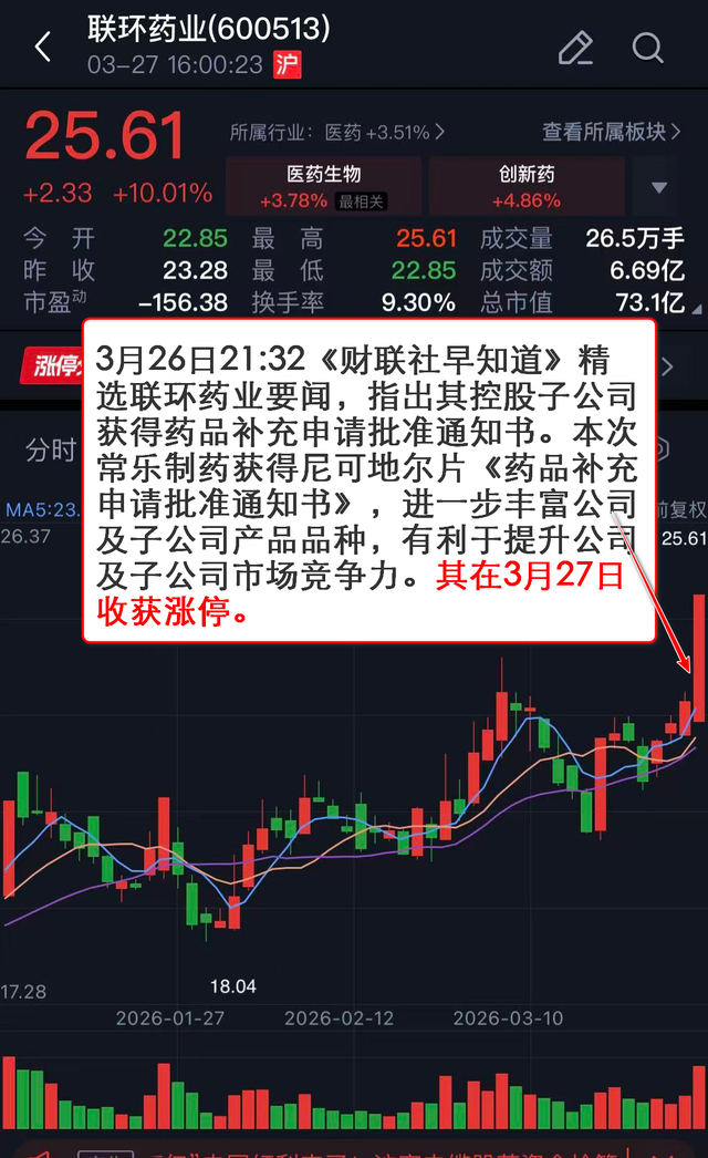 3月26日21:32《财联社早知道》 精选联环药业要闻,指出其控股子公司获得药品补充申请批准通知书。本次常乐制药获得尼可地尔片《药品补充申请批准通知书》,进一步丰富公司及子公司产品品种,有利于提升公司及子公司市场竞争力。其在3月27日收获涨停。