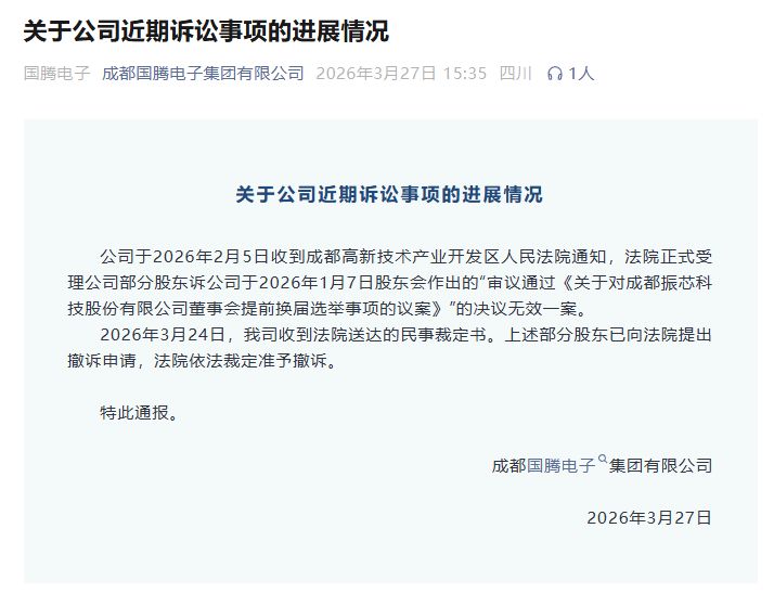 3月27日15时35分,振芯科技控股股东成都国腾电子集团有限公司(以下简称“国腾电子”)官方微信公众号发布通报,披露了一起诉讼的撤诉情况。该案件详情如下:“公司于2026年2月5日收到成都高新技术产业开发区人民法院通知,法院正式受理公司部分股东诉公司于2026年1月7日股东会作出的‘审议通过《关于对成都振芯科技股份有限公司董事会提前换届选举事项的议案》’的决议无效一案。2026年3月24日,我司收到法院送达的民事裁定书。上述部分股东已向法院提出撤诉申请,法院依法裁定准予撤诉。”
