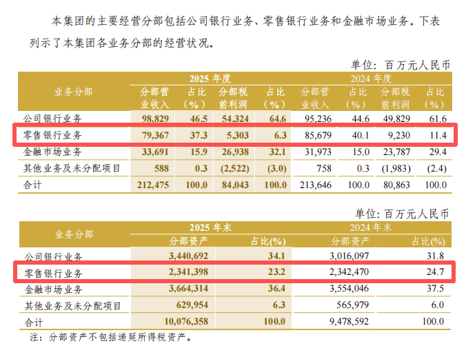 盈利大幅缩水:零售银行业务税前利润53.03亿元,同比下降42.55%;利润贡献度从2024年约11%跌至6%,零售资产占全行23.2%,却仅贡献个位数利润,投入产出严重倒挂。