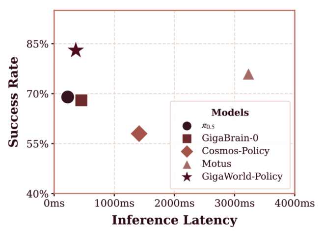 跨越实时控制门槛:对比 Motus,GigaWorld-Policy 不仅大幅缩减了显存占用,更实现了 10 倍的推理提速。这种毫秒级的响应能力至关重要——只有高效的执行速度,机器人才能游刃有余地应对现实环境中的动态干扰和执行误差,这也是其高成功率的底层基石。