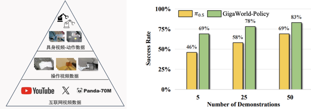 这种「基础能力大规模预训练 + 任务适配小样本微调」的分层范式,相较传统 VLA 训练方案,实现了整体训练效率 10 倍提升。