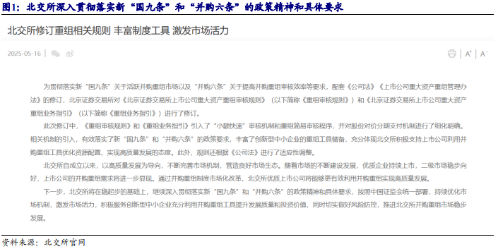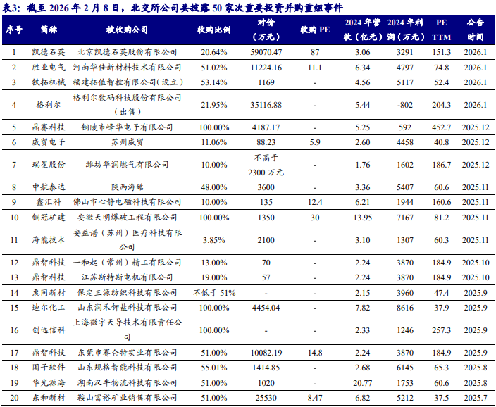 从新“国九条”到“并购六条”,2024 年起,并购重组市场迎来了诸多积极信号。 产业整合、跨界并购,为产业发展注入了新的动力。2025 年 10 月 29 日,中共 北京市委金融委员会办公室制定《北京市关于助力并购重组促进上市公司高质量 发展的意见》,意见涵盖六条核心内容,其中特别提到发挥证券交易场所并购重 组主阵地作用,支持北京证券交易所、全国中小企业股份转让系统股份有限公 司发挥服务创新型中小企业主阵地优势,成为中小企业并购重组交易首选地, 逐步做大影响力。我们认为,服务创新型中小企业的北交所能够及时把握并购机 遇。在北交所公司并购的趋势方向上,应重点关注:(1)同一集团内优质资源整 合;(2)新质生产力行业外延并购;(3)“强链补链”扩张版图式并购。截至 2026 年 2 月 8 日,北交所共发生 50 家次重要投资并购重组事件。