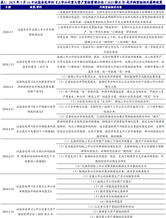 自 2024 年起,并购重组市场迎来了诸多积极信号。从新“国九条”到“并购六条”, 尤其是 2024 年 9 月 26 日中共中央政治局会议明确提出要支持上市公司开展并购重 组,一系列力度大且针对性强的政策密集出台。这些政策确立了以产业整合为核心 的上市公司并购逻辑,推动审核机制不断优化,朝着“小额快速”和“提高包容度”的方 向发展。这不仅激发了资本市场的活力,还为产业发展注入了新的动力。在地方层 面,政策的引导作用也十分明显。多个省市纷纷出台相关措施,加大对本地企业并 购重组的支持力度。地方国资成立并购基金的步伐也在加快。并购重组正逐渐成为 地方政府提升资产证券化率的重要手段。
