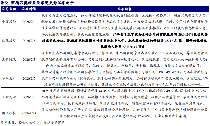 本双周(2026.1.26~2026.2.8)值得关注的公告主要包括:凯德石英控股股东将 变更为江丰电子,本次股份转让的价格为 38.17 元/股,股份转让价款总额为人民币 59,070.47 万元;长虹能源发布业绩快报归母净利润 2.49 亿元,同比增长 26.06%; 五新隧装新增控股股东的一致行动人;国义招标原控股股东粤新资产所持国义招标 股权(占总股本的 32.409%)无偿划转至广新集团。