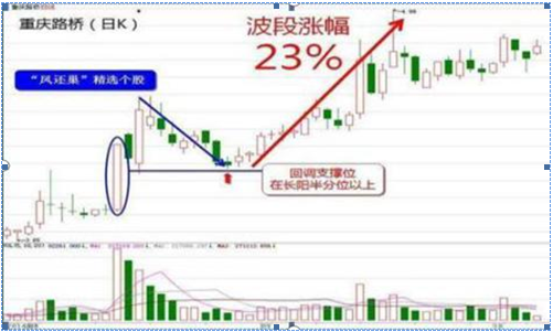 第一点就是必须有凤出现,存在涨停板或者上涨7%以上的K线,在这个形态出现以后会有一个回撤的动作,涨停板的位置立马追进,短线是有被套的可能的,正确的做法就是等待股价回撤。这就是所谓的凤还巢,首先是有凤出现,其次是有还巢,也就是回撤的走势。