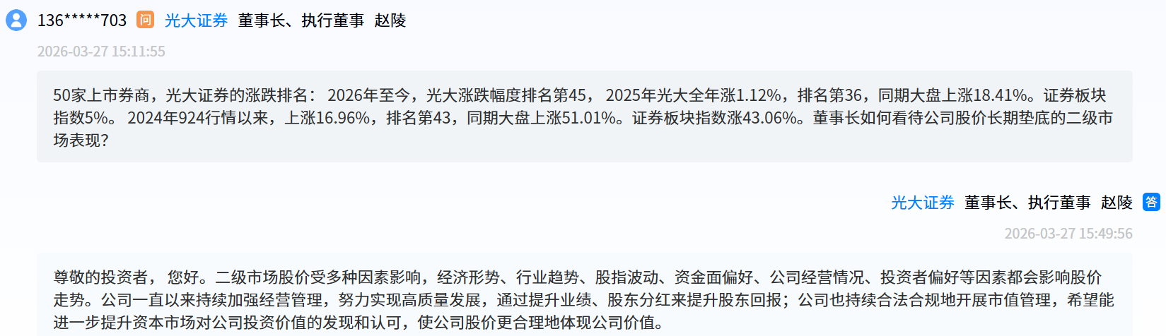 光大证券董事长、执行董事赵陵回应表示,二级市场股价受多种因素影响,经济形势、行业趋势、股指波动、资金面偏好、公司经营情况、投资者偏好等因素都会影响股价走势。公司一直以来持续加强经营管理,通过提升业绩、股东分红来提升股东回报;也持续合法合规地开展市值管理,希望能进一步提升资本市场对公司投资价值的发现和认可,使公司股价更合理地体现公司价值。
