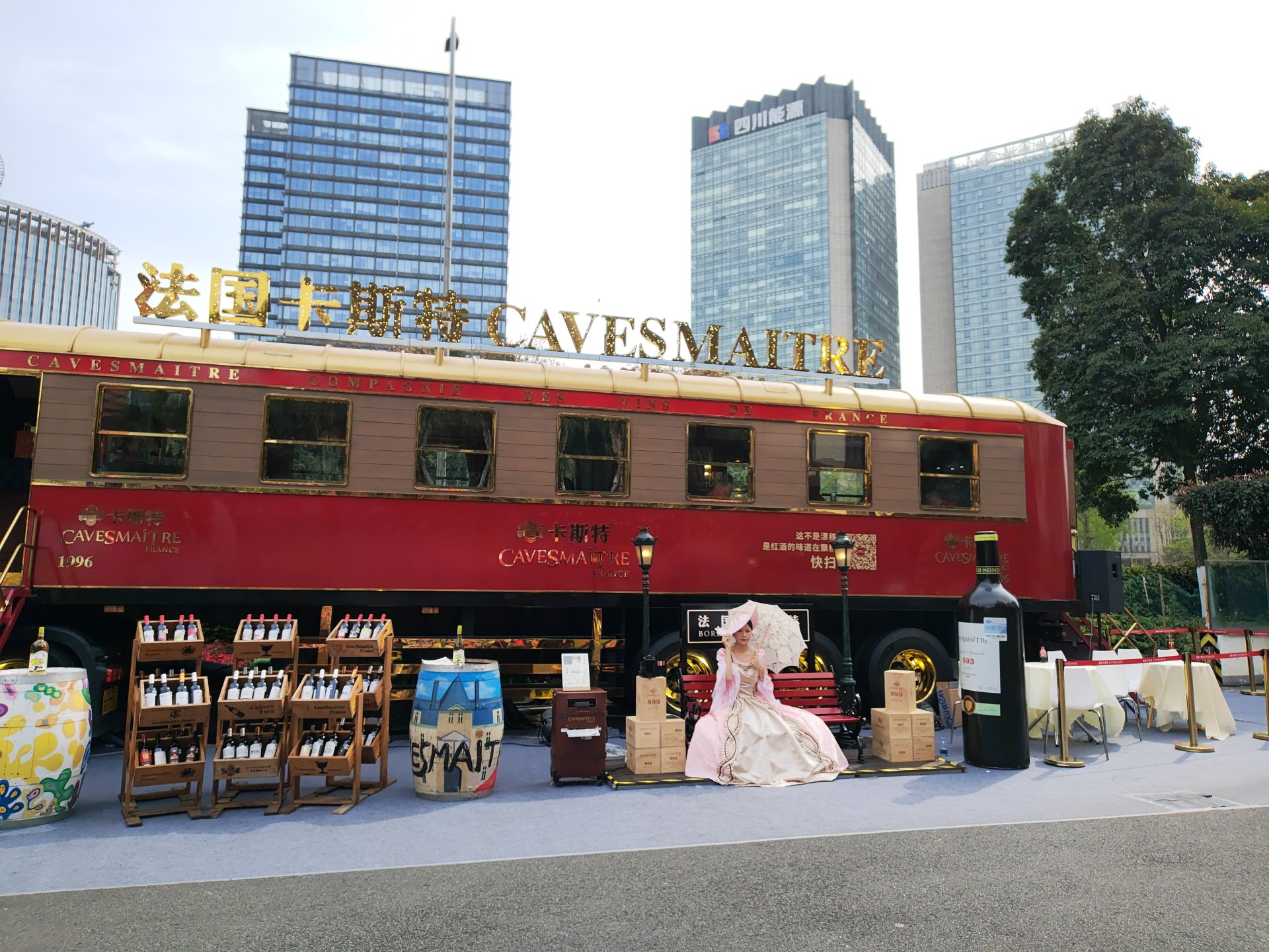 花园里,一家运营法国葡萄酒的厂商别出心裁,搭建了一截复古老火车车厢,车厢内摆放着精致的酒具,美丽的小姐姐身着华服撑着阳伞,眉眼间浅笑盈盈,令人仿佛来到了遥远的南法庄园。