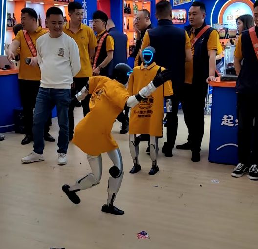 在某啤酒公司的展位前,两个身穿印有公司LOGO外衣的智能机器人,正在上演一场特别的表演。其中一个机器人正在打着“醉拳”,步伐踉跄却好似也有章法;另一个则在旁边“看热闹”。“两人”动作憨态可掬,就像是一对真人CP。这引得观众哈哈大笑,纷纷掏出手机录视频。工作人员借机邀请大家,到展位里详谈。