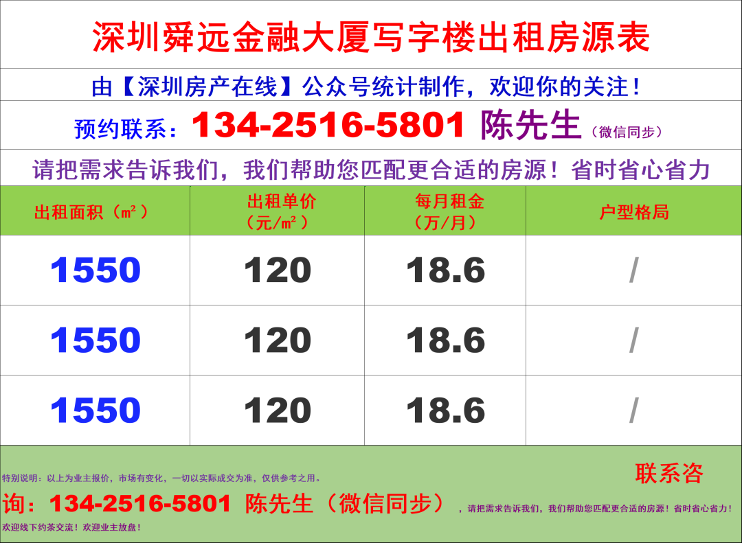 深圳舜远金融大厦写字楼办公室租金价格表