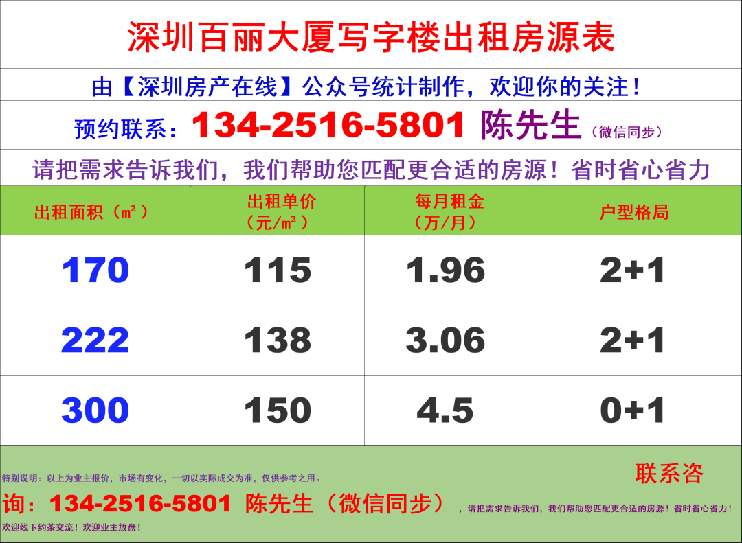深圳百丽大厦写字楼办公室租金价格表