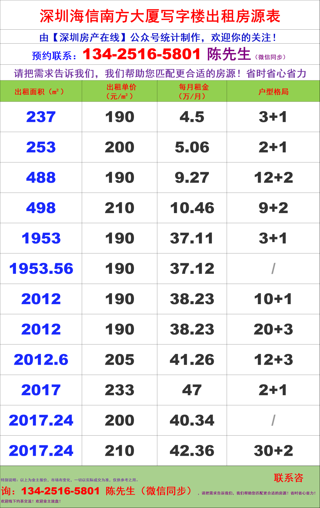 深圳海信南方大厦写字楼办公室租金价格表