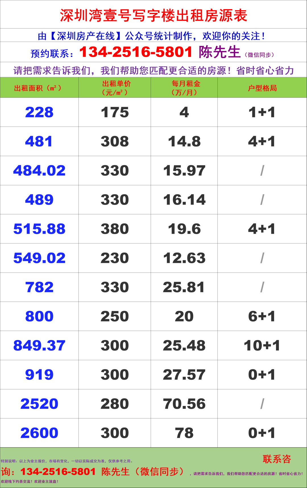 深圳湾壹号写字楼办公室租金价格表