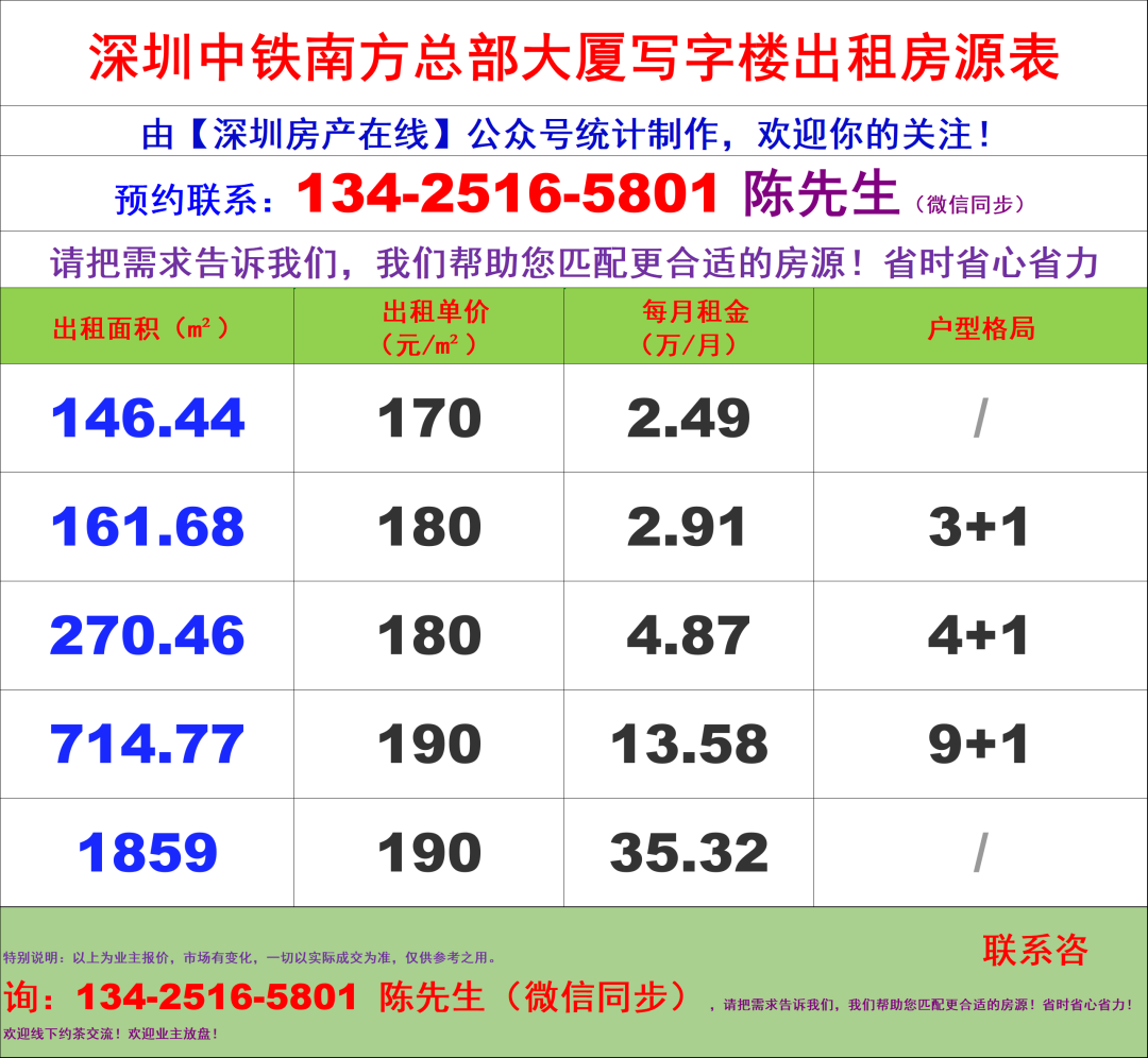 深圳中铁南方总部大厦写字楼办公室租金价格表