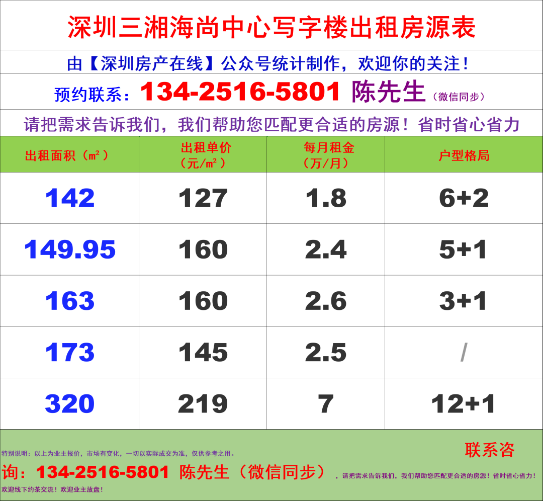 深圳三湘海尚中心写字楼办公室租金价格表