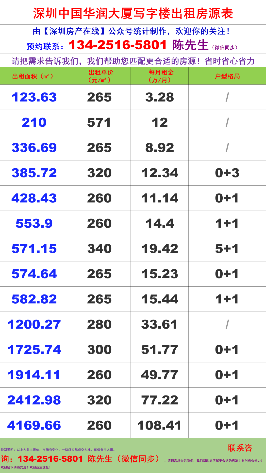 深圳中国华润大厦写字楼办公室租金价格表