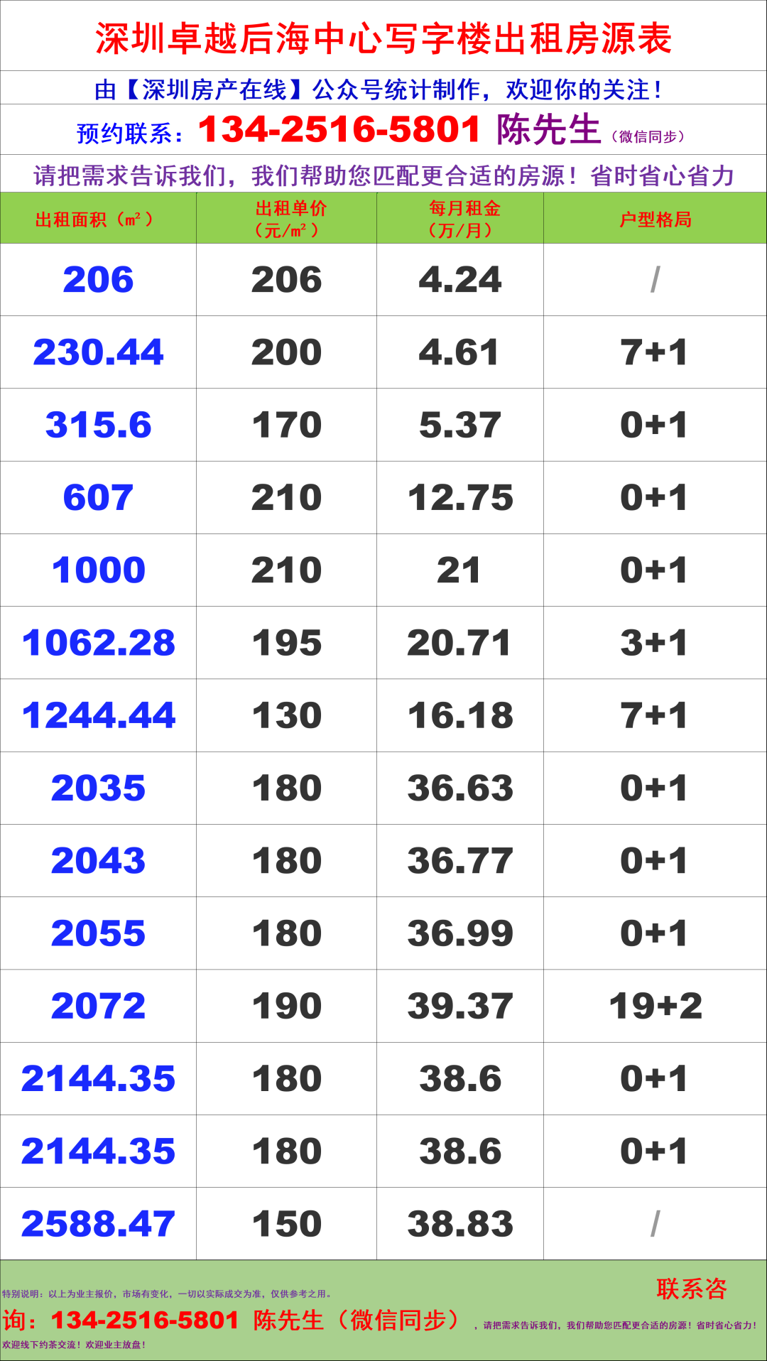 深圳卓越后海中心写字楼办公室租金价格表
