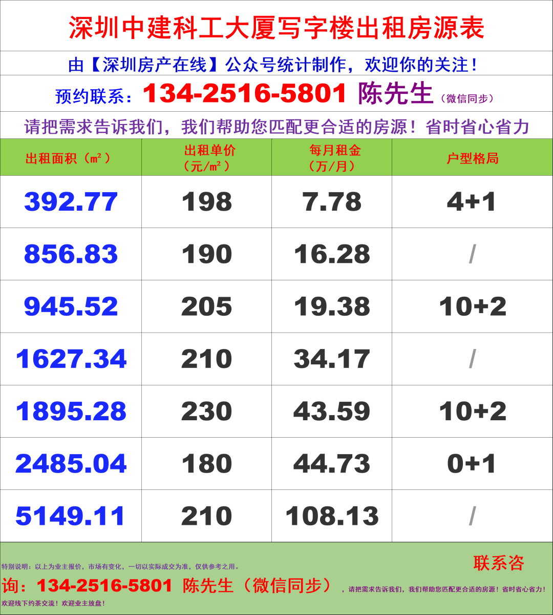 深圳中建科工大厦写字楼办公室租金价格表