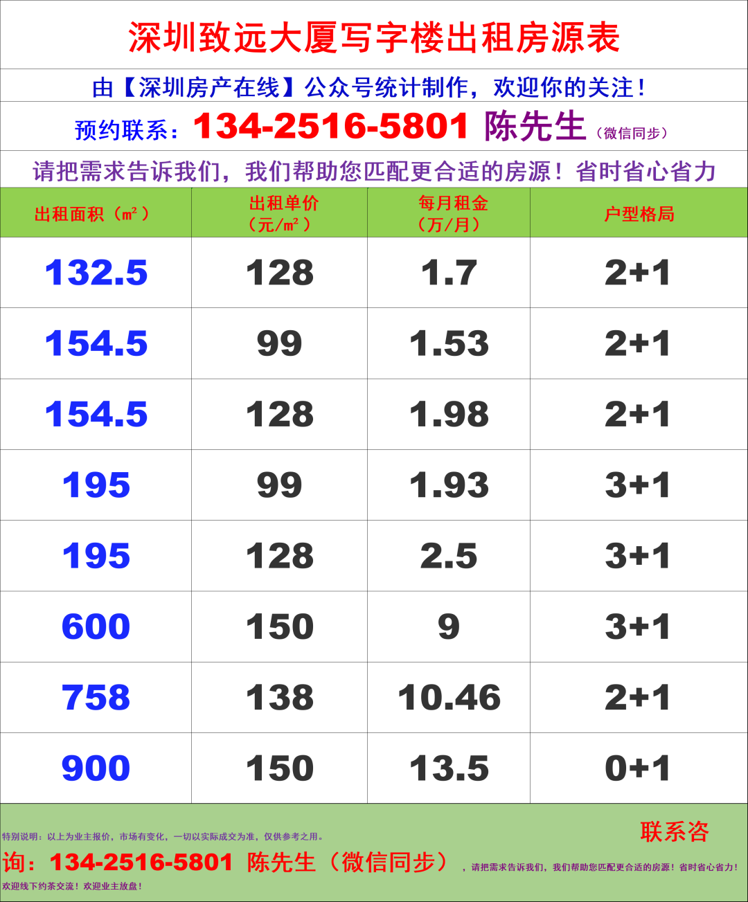 深圳致远大厦写字楼办公室租金价格表
