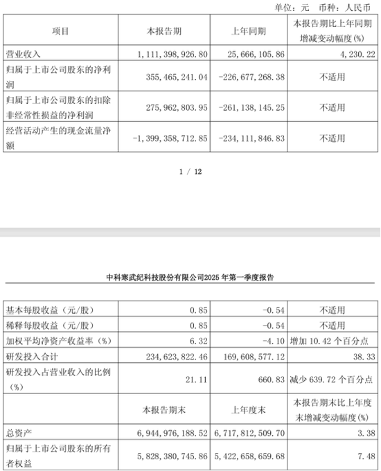 同一天,寒武纪还发布了2025年一季报,报告显示,公司实现总营收11.11亿元,同比增长4230.22%;实现净利润3.55亿元,同比扭亏为盈。