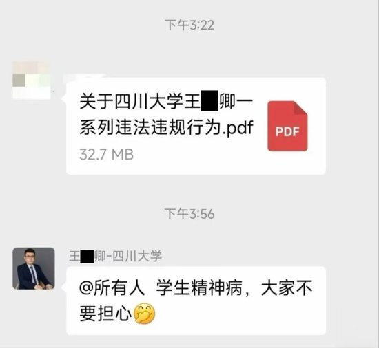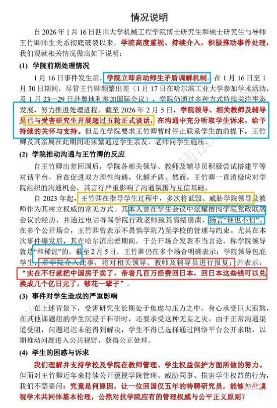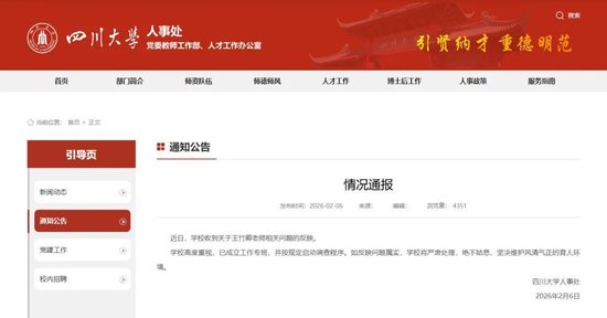 2月7日,四川大学通报回应:学校收到关于王某卿老师相关问题的反映。学校高度重视,已成立工作专班,并按规定启动调查程序。如反映问题属实,学校将严肃处理,绝不姑息,坚决维护风清气正的育人环境。