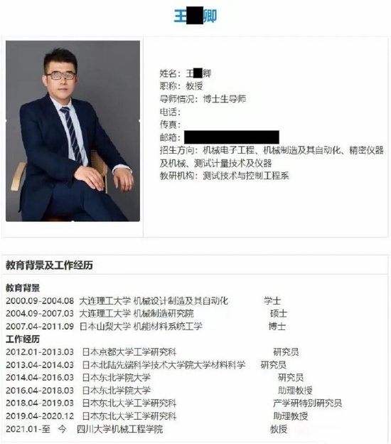 公开资料查询,王某卿2012-2021年任职日本多所高校,2021年通过“天府峨眉计划”入职四川大学,主持建设2000万元级实验室。
