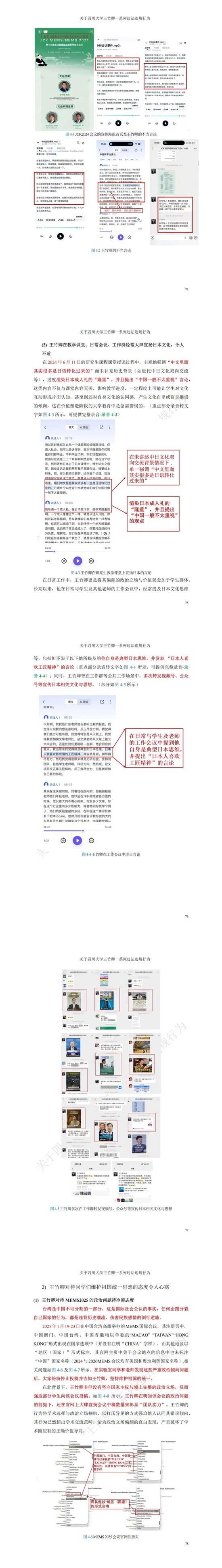 最后,w存在政治立场偏颇问题。他本人及家属具有日本永住居留权, 并多次公开场合不顾中国人民族情绪发表亲日言论,鼓吹日本,贬低中国,曾坚持要把其主办的2024JCK(中-日-韩)国际会议的开幕式定于9月18日,对于劝阻的人被他加以“记仇”的标签;2025年在中国台湾举办的MEMS国际会议有明显的政治倾向问题,w仍宣扬大肆投稿,对于坚定政治立场不投稿的老师和同学予以诋毁;长期在工作群转发宣传日本精神和文化氛围,让学生加以学习。