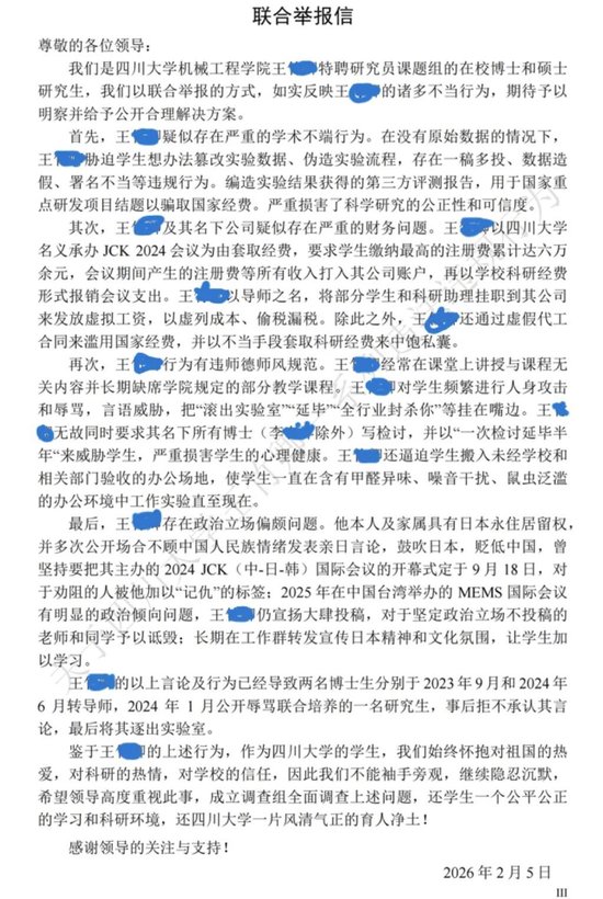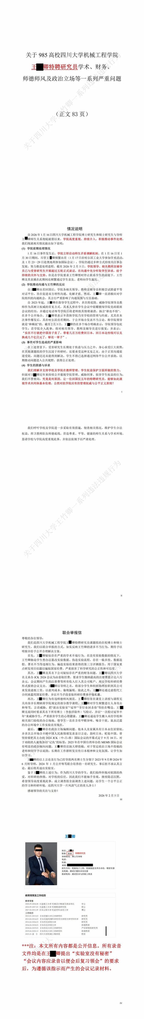近日,四川大学机械工程学院特聘研究员、博导王某卿,被课题组三十余名在读硕博生联名举报,一份长达83页的PDF材料,用实验记录、财务流水、聊天截图、会议录音等铁证,直指其学术不端、经费侵占、师德失范及政治立场争议四大重罪。