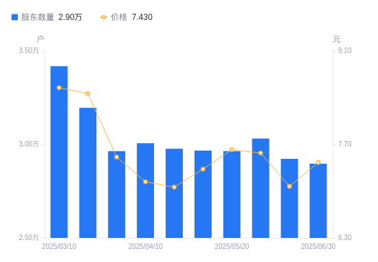7月2日消息,数据显示,截至2025年6月30日,威龙股份A股股东总户数为2.9万户,较上期(2025年6月20日)减少261户,降幅0.89%。公司最新A股总股本为3.32亿股,其中流通A股3.32亿股,户均持有流通A股数量为1.15万股,较上期增加102.38股,增幅0.90%;户均持流通A股市值8.52万元,较上期增加4839.71元,增幅6.02%。