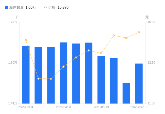 近一年(2024年7月10日至2025年7月10日),奥联电子A股股东户数从2.63万户,减低至1.6万户,降幅39.39%,区间股价上涨44.05%。
