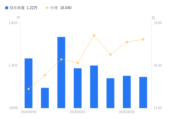 7月17日消息,数据显示,截至2025年6月30日,元利科技A股股东总户数为1.23万户,较上期(2025年6月20日)增加172户,增幅1.42%。公司最新A股总股本为2.08亿股,其中流通A股2.08亿股,户均持有流通A股数量为1.7万股,较上期减少240.87股,降幅1.40%;户均持流通A股市值30.32万元,较上期增加8413.79元,增幅2.85%。