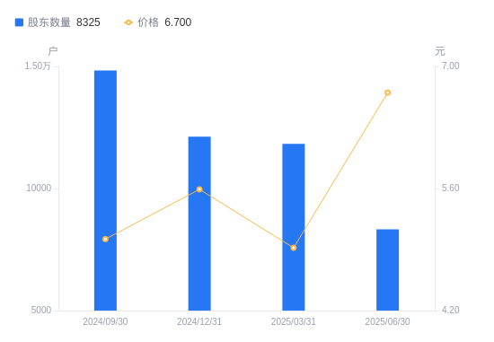 7月21日消息,数据显示,截至2025年6月30日,*ST四通A股股东总户数为8325户,较上期(2025年3月31日)减少3504户,降幅29.62%。公司最新A股总股本为3.2亿股,其中流通A股3.2亿股,户均持有流通A股数量为3.84万股,较上期增加1.14万股,增幅42.09%;户均持流通A股市值25.76万元,较上期增加12.44万元,增幅93.50%。