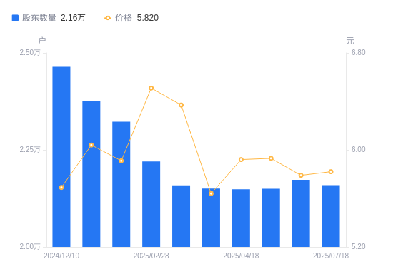 近一年(2024年7月19日至2025年7月18日),ST先河A股股东户数从3.16万户,减低至2.16万户,降幅31.70%,区间股价上涨39.57%。