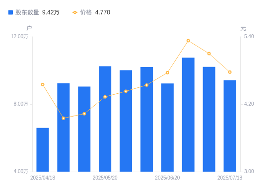 近一年(2024年7月19日至2025年7月18日),保税科技A股股东户数从5.69万户,增加至9.42万户,增幅65.62%,区间股价上涨58.47%。