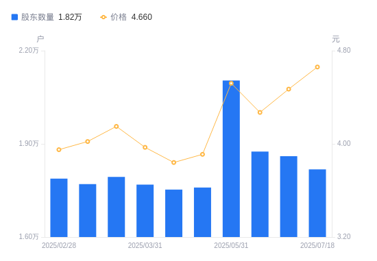 7月24日消息,数据显示,截至2025年7月18日,联泰环保(维权)A股股东总户数为1.82万户,较上期(2025年6月30日)减少427户,降幅2.30%。公司最新A股总股本为5.84亿股,其中流通A股5.84亿股,户均持有流通A股数量为3.22万股,较上期增加737.95股,增幅2.35%;户均持流通A股市值14.98万元,较上期增加9407.87元,增幅6.70%。