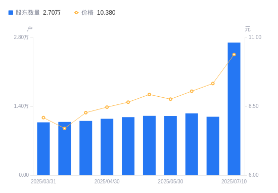 近一年(2024年7月10日至2025年7月10日),新通联A股股东户数从1.22万户,增加至2.7万户,增幅121.53%,区间股价上涨53.05%。