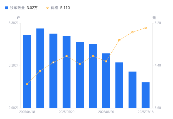 7月24日消息,数据显示,截至2025年7月18日,华平股份A股股东总户数为3.02万户,较上期(2025年7月10日)减少500户,降幅1.63%。公司最新A股总股本为5.44亿股,其中流通A股5.42亿股,户均持有流通A股数量为1.79万股,较上期增加292.06股,增幅1.65%;户均持流通A股市值9.17万元,较上期增加2904.42元,增幅3.27%。