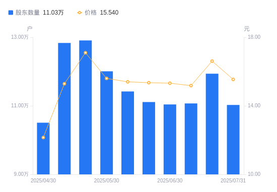 近一年(2024年7月31日至2025年7月31日),襄阳轴承A股股东户数从3.88万户,增加至11.03万户,增幅184.05%,区间股价上涨312.20%。