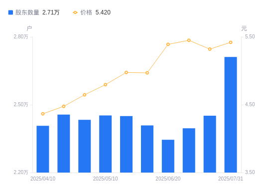 近一年(2024年7月31日至2025年7月31日),凯恩股份A股股东户数从3.09万户,减低至2.71万户,降幅12.31%,区间股价上涨75.63%。