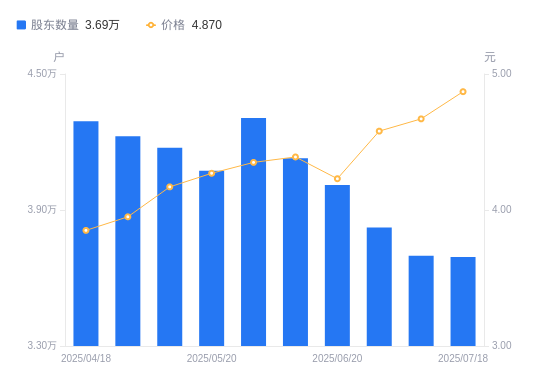 8月1日消息,数据显示,截至2025年6月30日,金冠股份A股股东总户数为3.82万户,较上期(2025年6月20日)减少1870户,降幅4.66%。公司最新A股总股本为8.25亿股,其中流通A股8.25亿股,户均持有流通A股数量为2.16万股,较上期增加1006.02股,增幅4.89%;户均持流通A股市值9.88万元,较上期增加1.18万元,增幅13.57%。