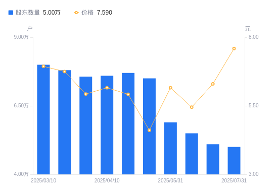 近一年(2024年7月31日至2025年7月20日),*ST椰岛A股股东户数从6.7万户,减低至5.1万户,降幅23.88%,区间股价下跌27.59%。