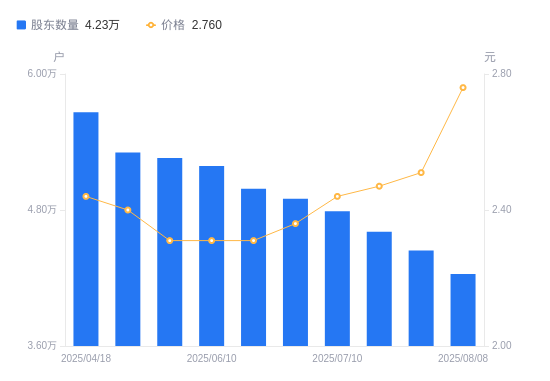 8月11日消息,数据显示,截至2025年8月8日,华英农业A股股东总户数为4.23万户,较上期(2025年7月31日)减少2071户,降幅4.66%。公司最新A股总股本为21.33亿股,其中流通A股21.24亿股,户均持有流通A股数量为5.02万股,较上期增加2338.6股,增幅4.89%;户均持流通A股市值13.84万元,较上期增加1.84万元,增幅15.34%。