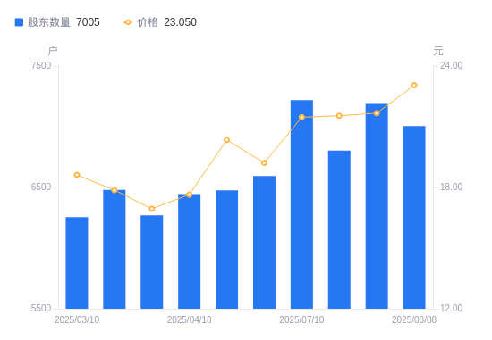 8月11日消息,数据显示,截至2025年8月8日,雅艺科技A股股东总户数为7005户,较上期(2025年7月31日)减少190户,降幅2.64%。公司最新A股总股本为9100万股,其中流通A股5511.75万股,户均持有流通A股数量为7868.3股,较上期增加207.78股,增幅2.71%;户均持流通A股市值18.14万元,较上期增加1.54万元,增幅9.25%。